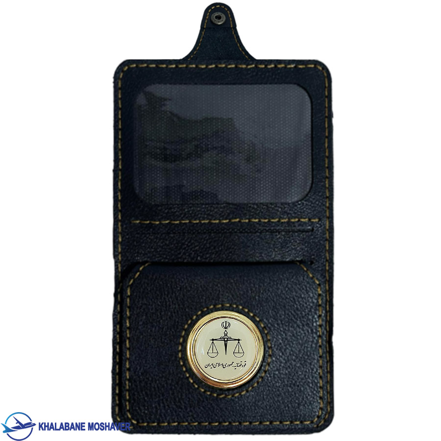 کیف پول دکمه دار قوه قضایی به رنگ مشکی، دارای آرم مصوب فلزی مناسب برای پرسنل محترم قوه قضایی.