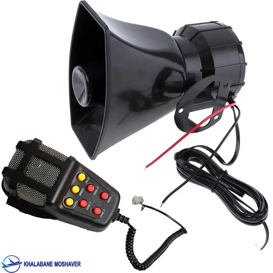 آژیر و بلندگو صد واتی ۷ دکمه قابل نصب بر روی تمامی خودرو ها و موتور سیکلت با ورودی برق ۱۲ ولت.